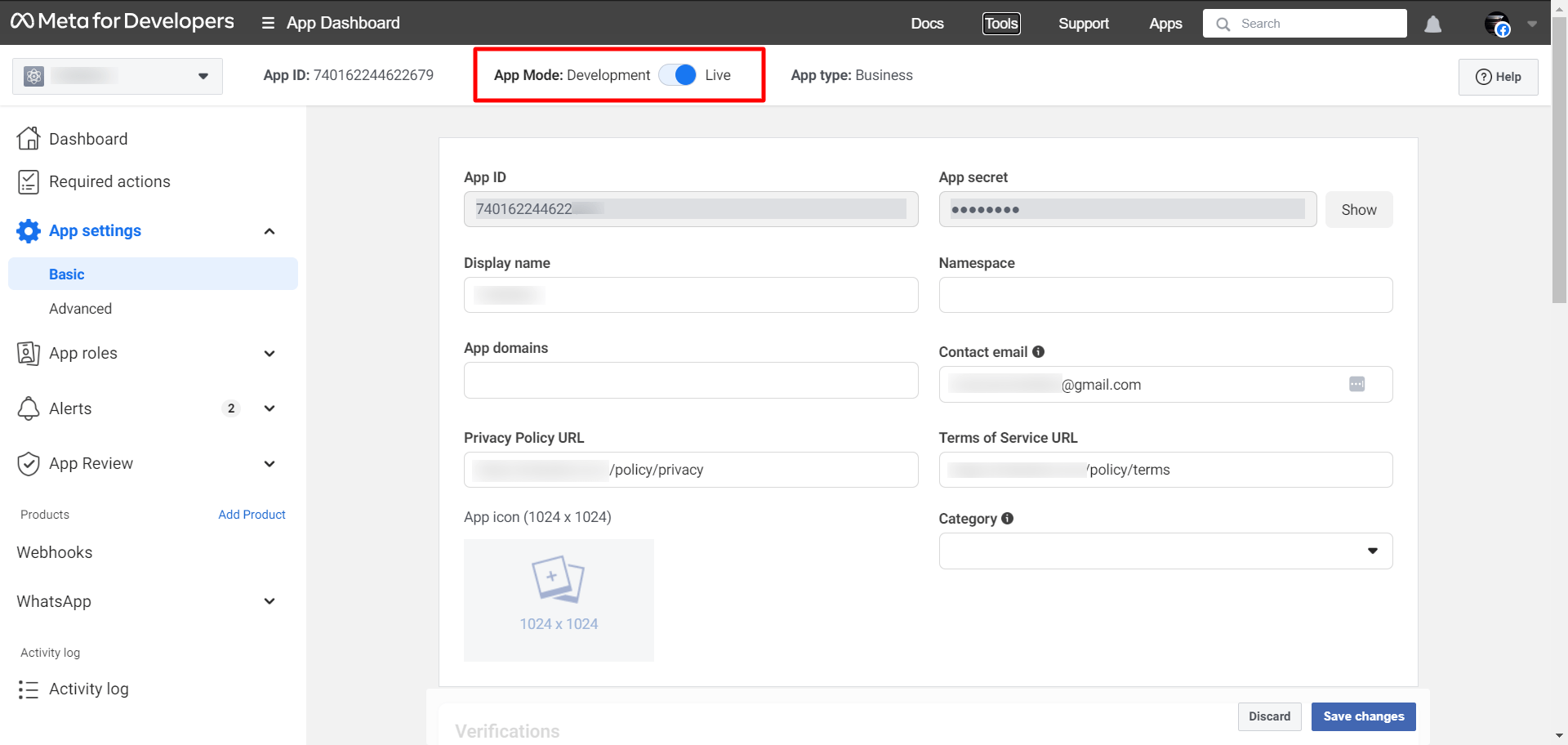 Then from the App settings, click on the Basic option and add the Privacy Policy URL and Terms of Service URL from the Wondropy. These URLs are available on the Connect bot page of Wondropy. After adding these URLs just click on the “Save changes” button.
